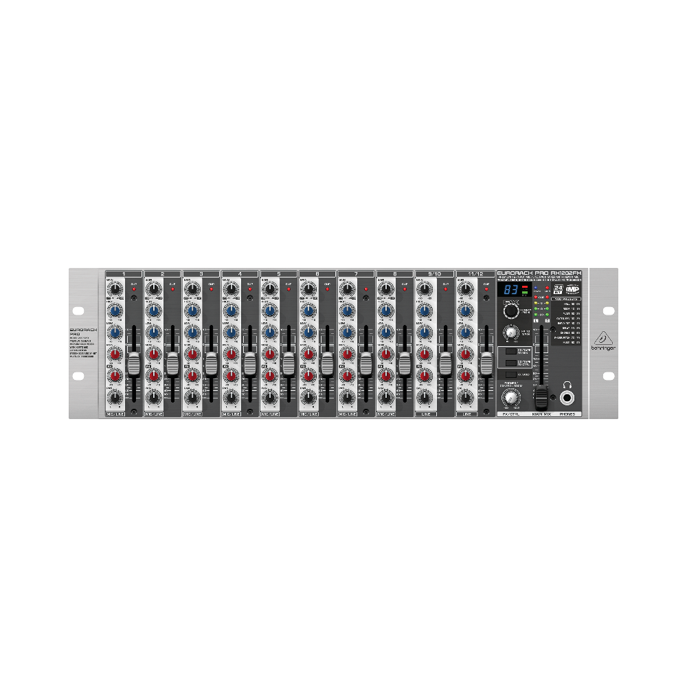 EURORACK PRO RX1202FX позволяет оперировать 8 монофоническими и 2 стереофоническими каналами. Входная секция расположена на задней панели корпуса. Помимо основных разъёмов там находятся гнёзда разрывов для моноканалов, к которым можно подключить компрессоры, предусилители и другое вспомогательное оборудование, восемь микрофонных входов, предусилители для которых уже встроены в EURORACK PRO RX1202FX, и вход 2-Track. Для подключения к микшеру конденсаторных микрофонов можно подать на входы фантомное питание 48 V. Инструменты настройки звучания включают в себя двухполосные канальные эквалайзеры, 60-миллиметровые логарифмические фейдеры громкости и регуляторы баланса. Все поворотные контроллеры являются герметичными, что позволяет избежать «расстройки» во время эксплуатации. Избегать превышения уровня сигнала помогают индикаторы клиппирования. Для каждого канала предусмотрено по два посыла на шины: префейдерный, для выходов мониторинга, и постфейдерный – для встроенного или внешнего эффект-процессора.
