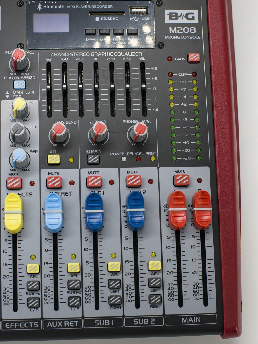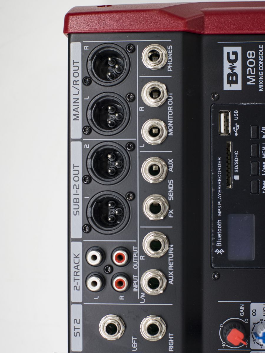 BG M208 Пульт микшерный, 6 моно, 2 стерео, USB/SD MP3 плеер, процессор эффектов, 7 полосный эквалайзер, 2 подгруппы, фантомное питание