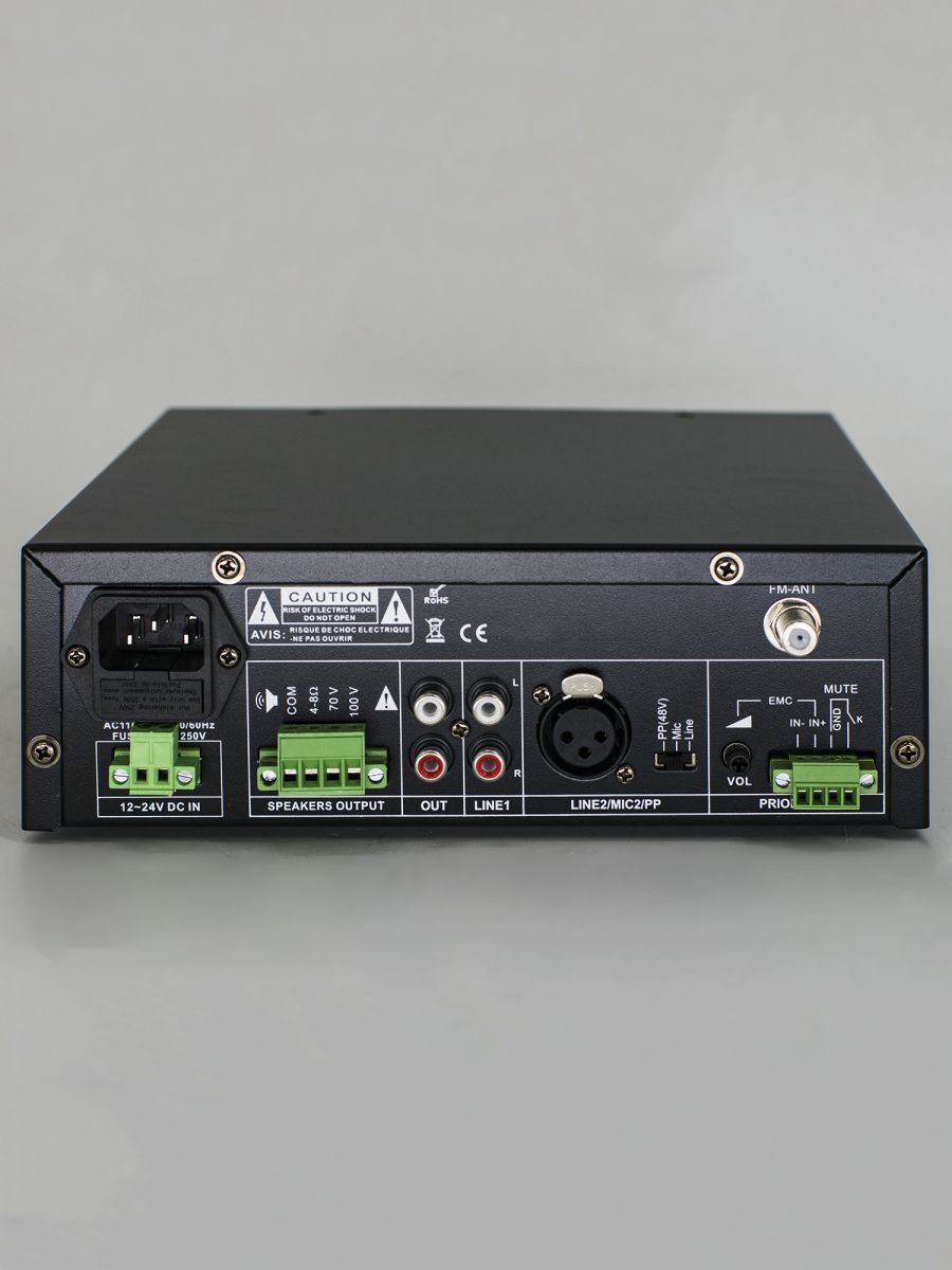 Мощность: 60 Вт Разъемы: 1 Mic, 1 Line Линейный выход: 70В/100В/4-8Ом USB/SD Mp3 плеер, FM тюнер, Bluetooth, Echo