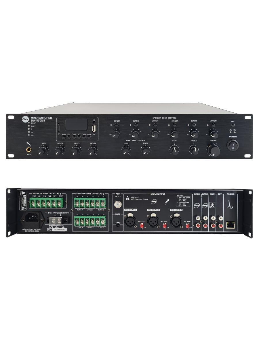 CMX Audio DA-500MT Микшер усилитель 500 Вт, Mp3, SD, USB, BT, FM тюнер, 4 Mic, 3 Aux, 70V/100V/4-16ohm, 6 зон аттенюатор