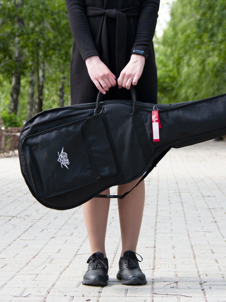 CNB CB400 3/4 – это стильный и качественный чехол для классической гитары 3/4. Главное назначение модели – оберегать инструмент от внешних воздействий окружающей среды, которые негативно сказываются как на внешнем виде гитары, так и на ее звучании. Чехол изготовлен из водонепроницаемого нейлона с плотностью 600 D. Защитное уплотнение толщиной 7 мм предотвращает появление царапин и потертостей на инструменте. Чехол закрывается на прочную молнию с крепкими зипперами. Модель имеет большой наружный карман для хранения нот и гитарных аксессуаров. Заплечный ремень позволяет с удобством переносить гитару за спиной. Для транспортировки инструмента в горизонтальном положении имеются две прочные боковые ручки. Модель CNB CB400 3/4 выполнена в черном цвете, однако классический дизайн прекрасно дополняет логотип компании, расположенный на кармане. Чехол CNB CB400 3/4 создан не только для надежной защиты инструмента, но и для вашего комфорта.